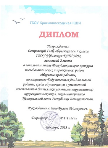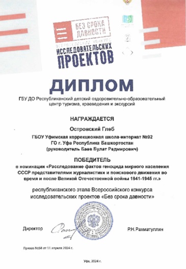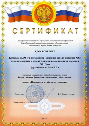 | 4. | Проведение экскурсий, участие в конкурсах исследовательских работ. | Победитель в региональном этапе Всероссийского конкурса исследовательских проектов «Без срока давности» среди обучающихся общеобразовательных организаций и образовательных учреждений среднего профессионального образования Республики Башкортостан по тематическому направлению: «Расследование фактов геноцида мирного населения СССР представителями журналистики и поискового движения во время и после Великой Отечественной войны 1941˗1945 годов». II место в зональном этапе республиканского конкурса исследовательских и проектных работ «Изучаем край родной», посвященному Году полезных дел для малой родины, среди обучающихся с умственной отсталостью. Участник республиканского этапа Всероссийского фестиваля краеведческих объединений в треке «Поисковая и музейная деятельность». |