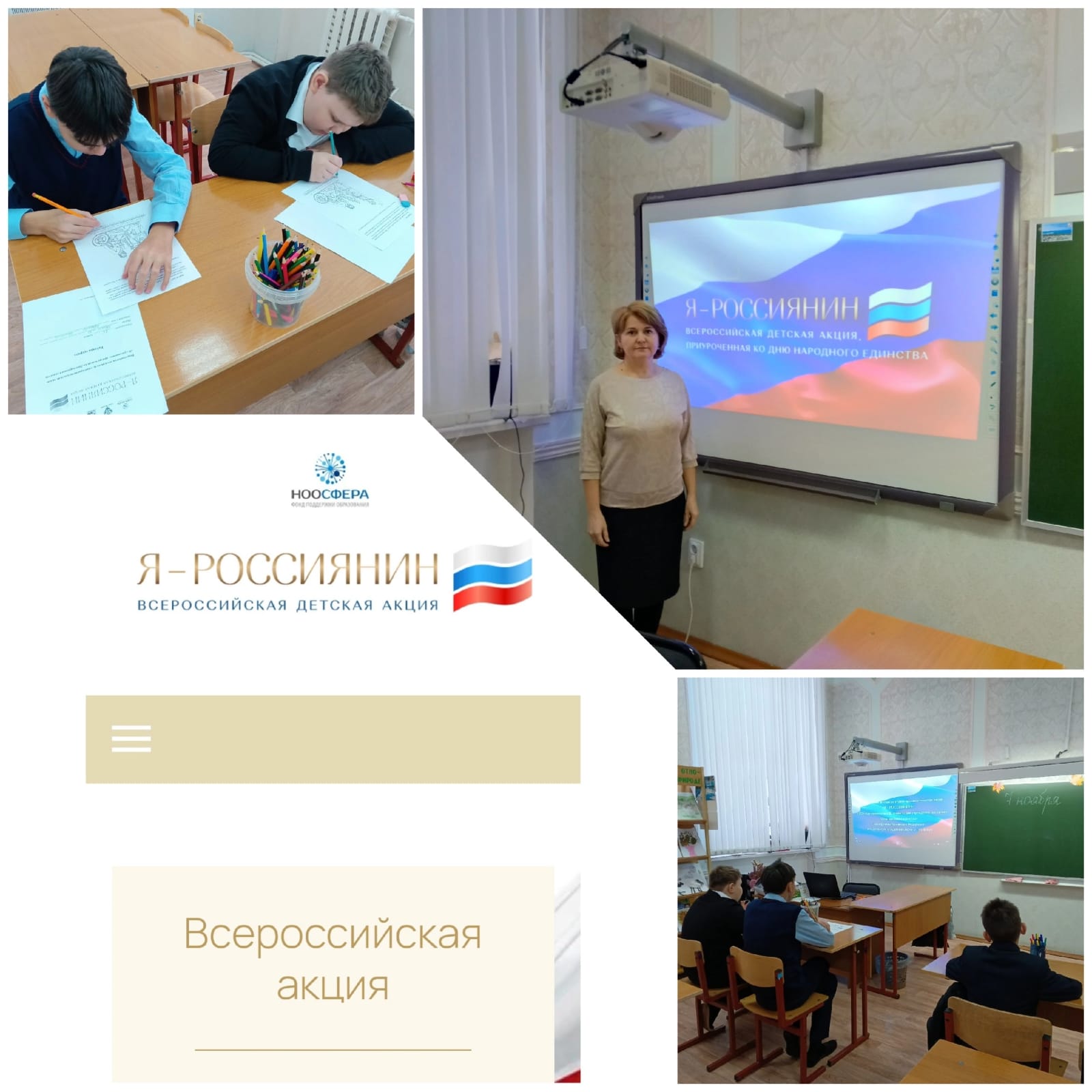 Учащиеся и педагоги нашей школы приняли участие во Всероссийской культурно-просветительской акции «Я — россиянин». Акция, посвященная Дню народного единства, разработана Фондом поддержки образования «Ноосфера» в формате электронного урока и имеет духовно-нравственную и гражданственную направленность.