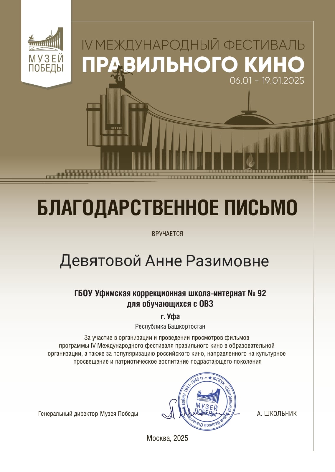⭐ С 06 по 19 января 2025 года обучающиеся нашей школы приняли активное участие в IV Международном фестивале правильного кино. За участие в организации и проведении просмотров фильмов программы IV Международного фестиваля правильного кино в образовательной организации, а также за популяризацию российского кино, направленного на культурное просвещение и патриотическое воспитание подрастающего поколения нам вручено благодарственное письмо генеральным директором Музея Победы А. Школьник, г. Москва